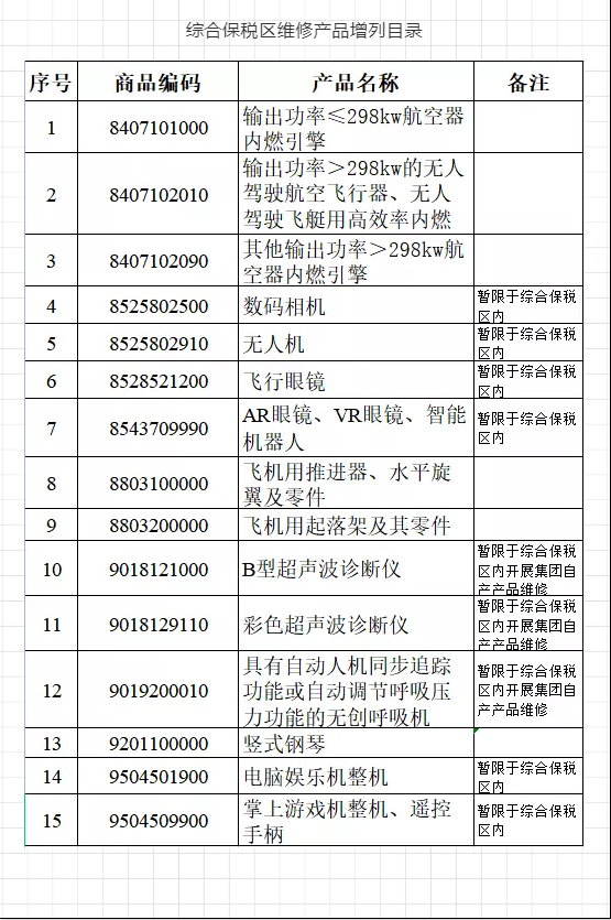 自貿試驗區內的綜合保稅區企業可開展本集團國內自產產品的維修,不受維修產品目錄限制。