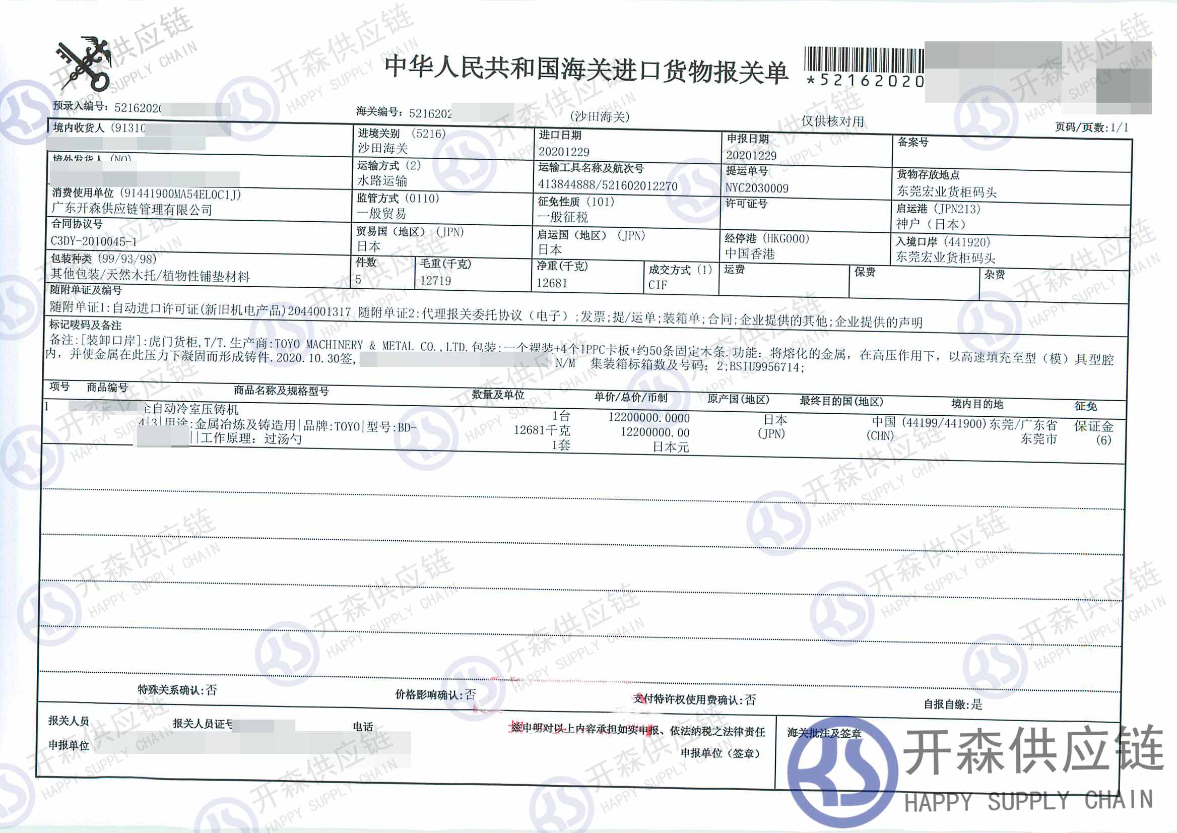 從日本進(jìn)口全自動(dòng)壓鑄機(jī)等到東莞碼頭,我司提供門到門進(jìn)口一站式清關(guān)服務(wù),開森擁有十余年機(jī)械設(shè)備進(jìn)口清關(guān)經(jīng)驗(yàn)及案例,為客戶提供量身制作的進(jìn)口方案,讓客戶進(jìn)口省時(shí)省心省成本。