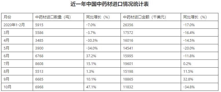 2020年1-10月中國中藥材進口數(shù)量為53428噸,增幅為3.3%;進口金額為155981千美元,降幅為10%;2020年1-10月中國中藥材進口均價為2.92千美元/噸。
